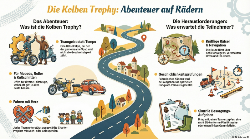 Die Kolbentrophy lädt dich ein, auf eine unvergessliche Reise durch malerische Landschaften zu gehen. Gemeinsam mit Freunden oder Gleichgesinnten löst du knifflige Rätsel und entdeckst verborgene Orte. Ob auf dem Motorrad, Vespa oder Auto – bei uns steht der Spaß am gemeinsamen Erlebnis im Vordergrund.
